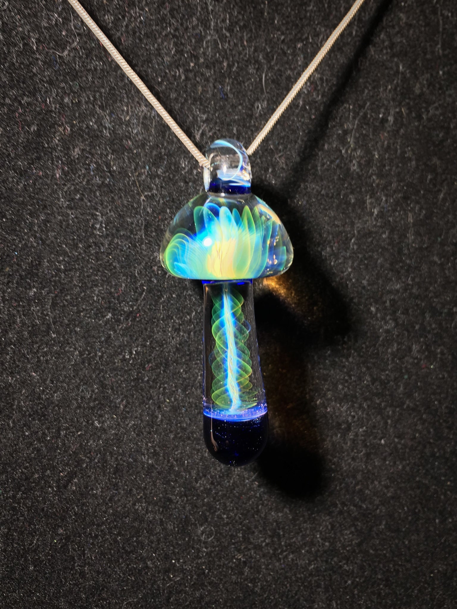 Pure silver and gold fumes create the spectrums in this magical pendant. Features a “ continuum “ reversed spiral in the cap and A handmixed sparkle blue base with pink slyme highlight.  Will shift spectrums in different sources of light. Signed and dated and comes with stickers. Chain not included.