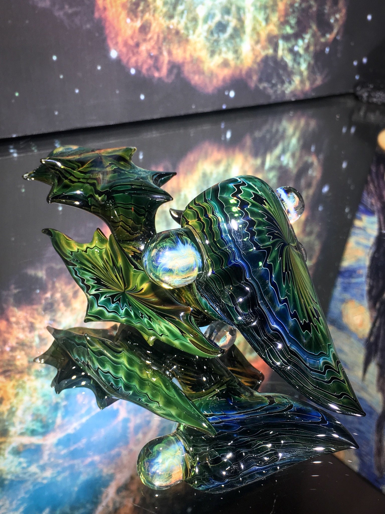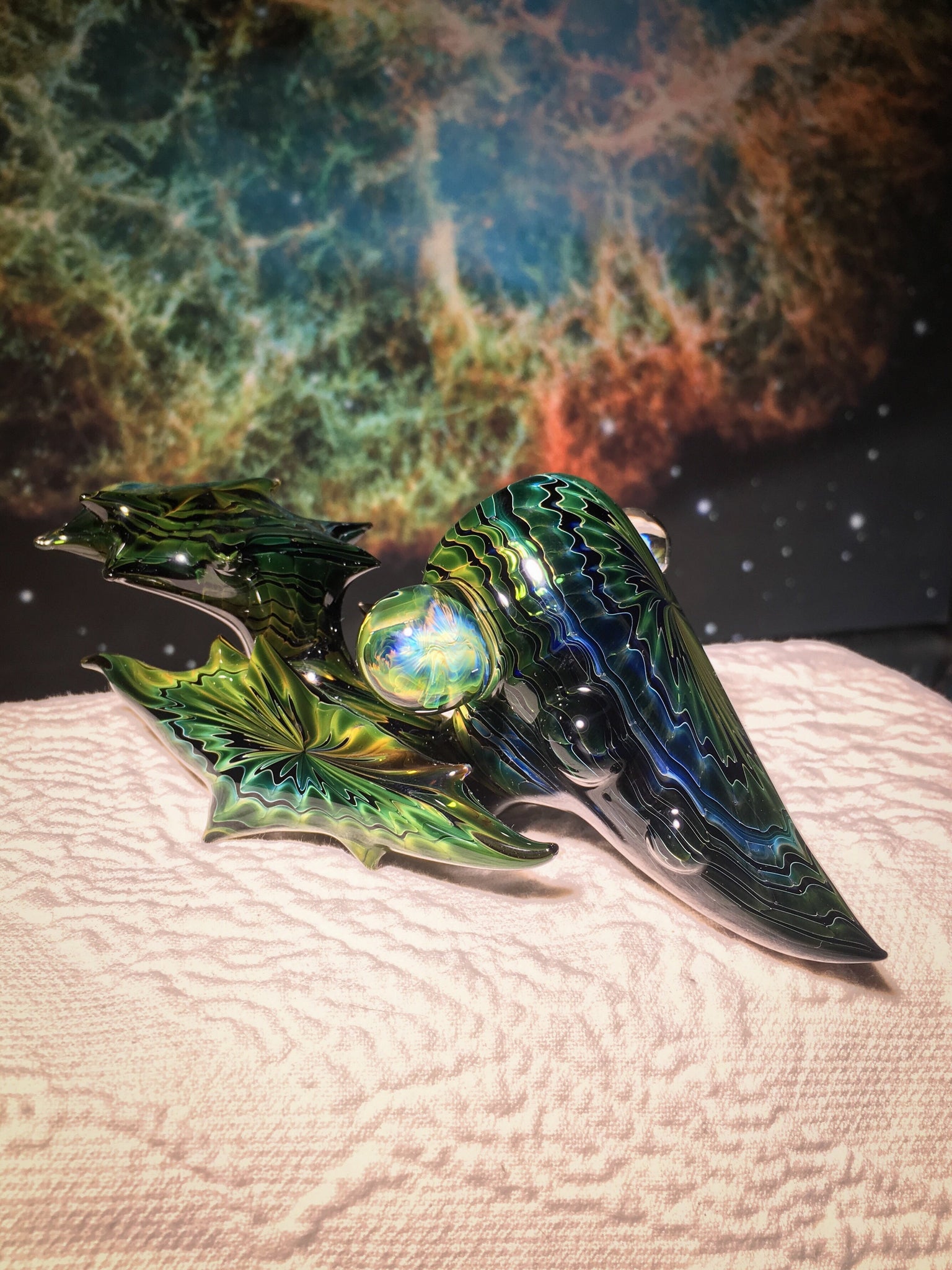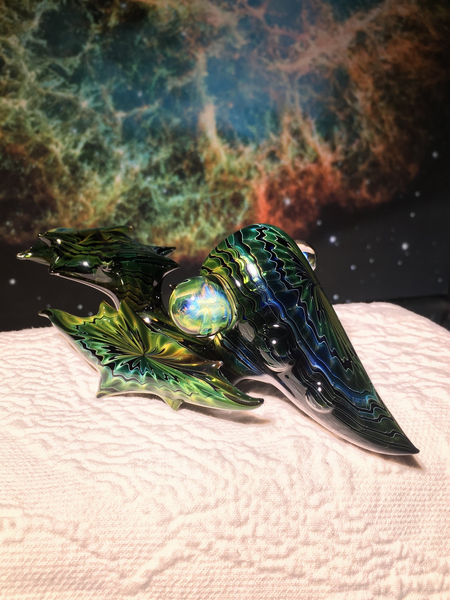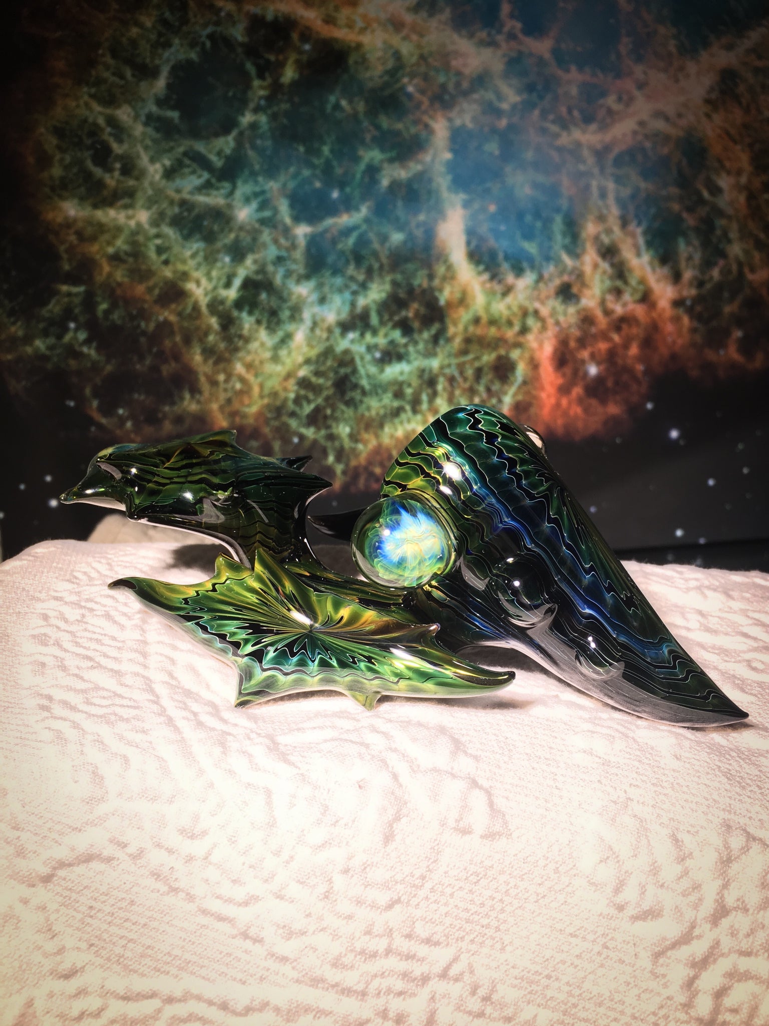 Pure Gold and silver fume rake patterns on black create the the spectrums and portal holes in this unique piece of functional art.