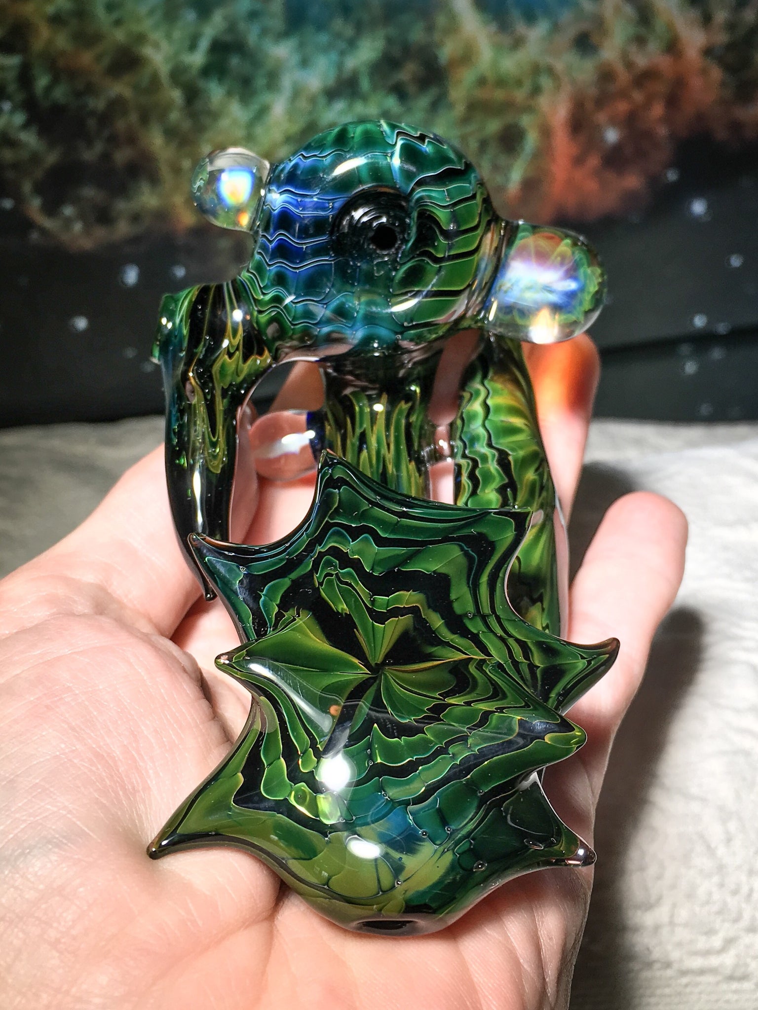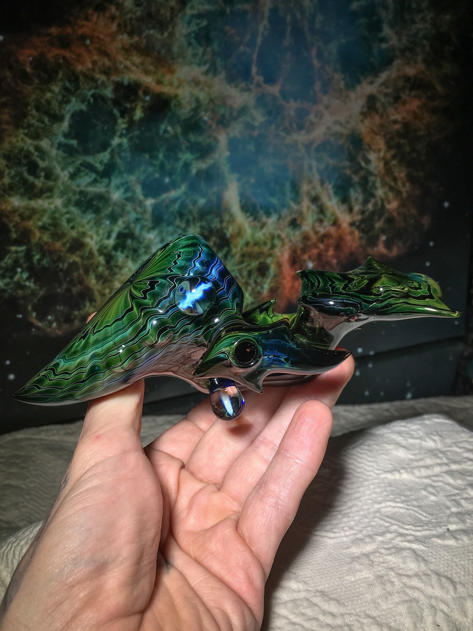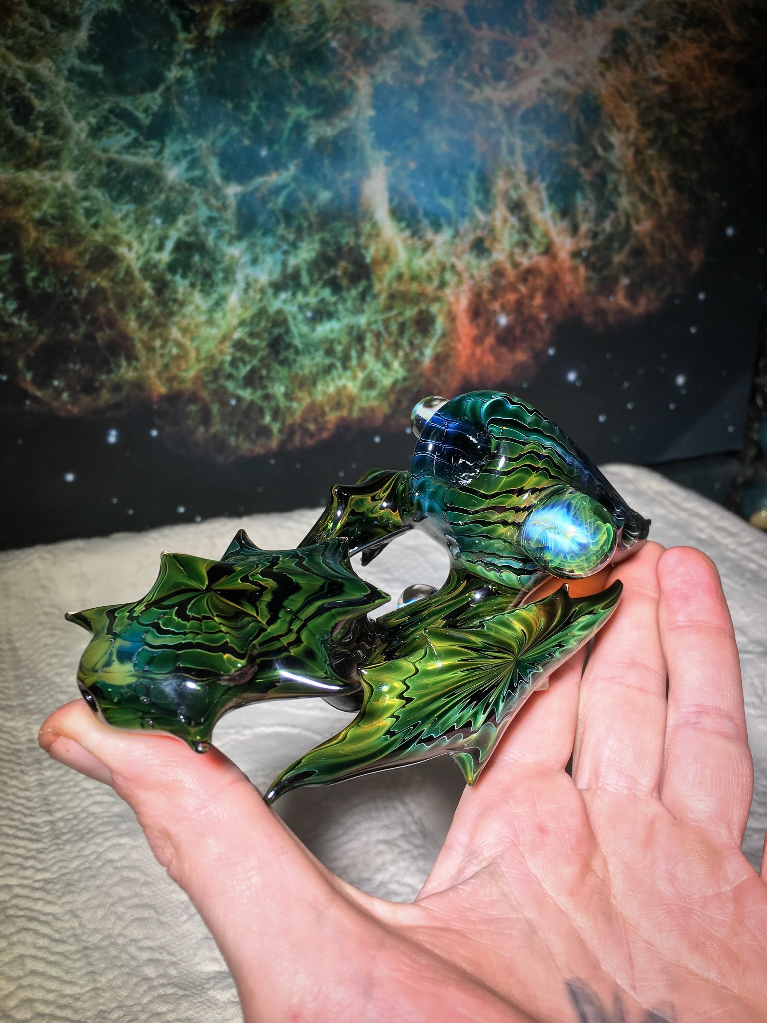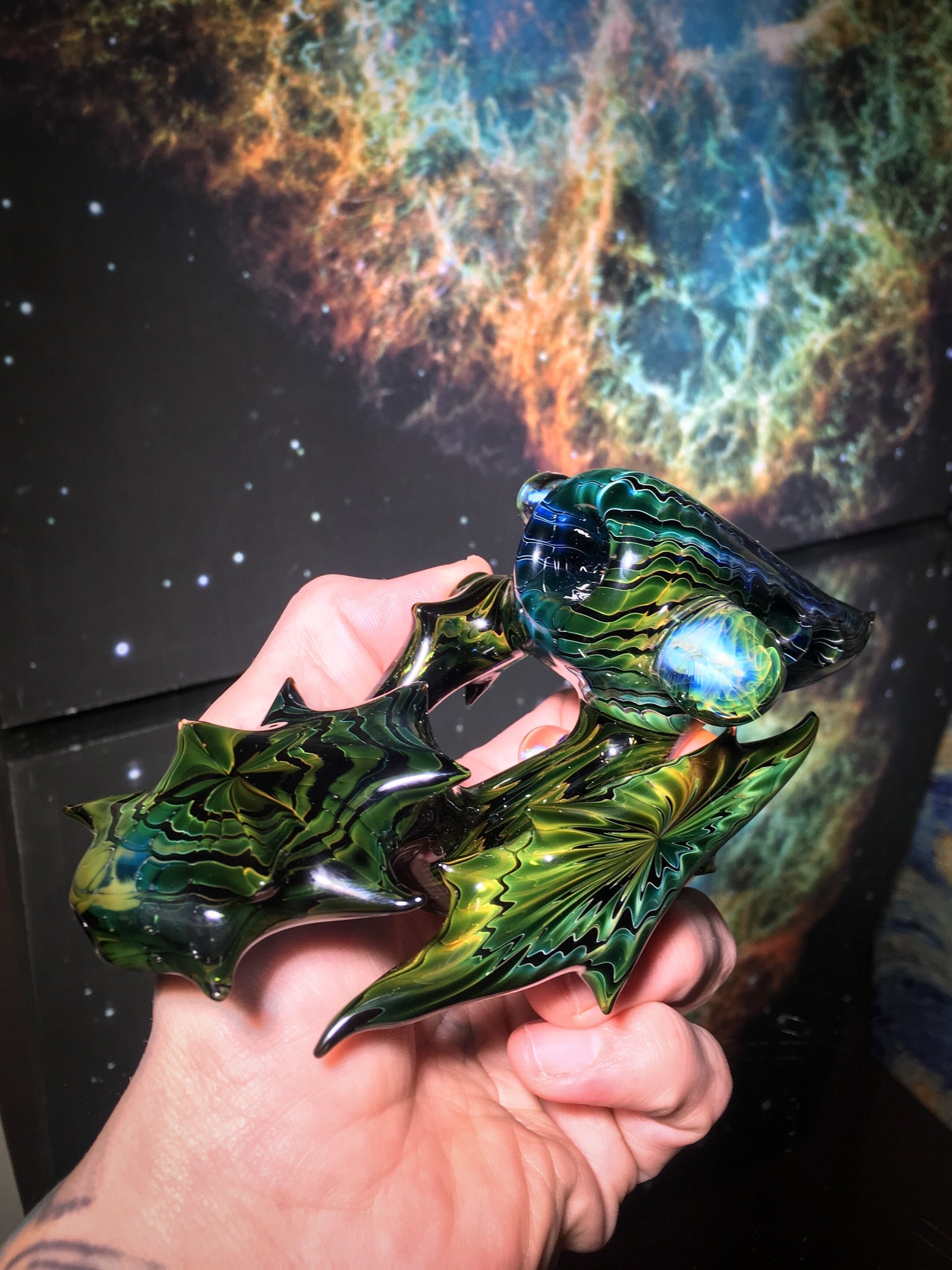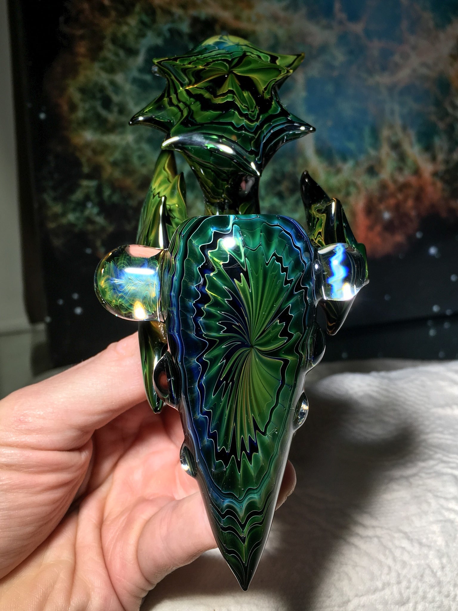 Pure Gold and silver fume rake patterns on black create the the spectrums and portal holes in this unique piece of functional art.
