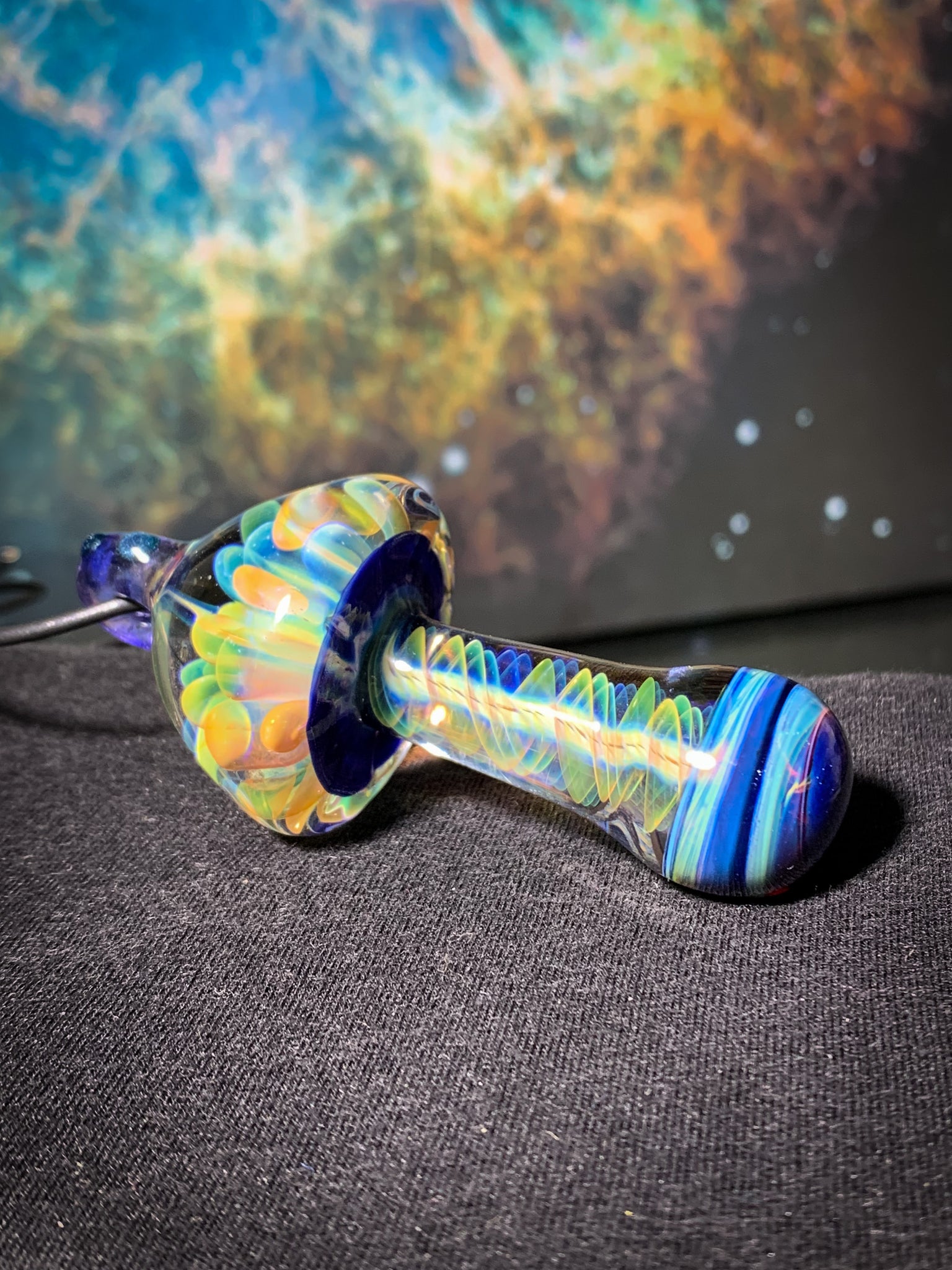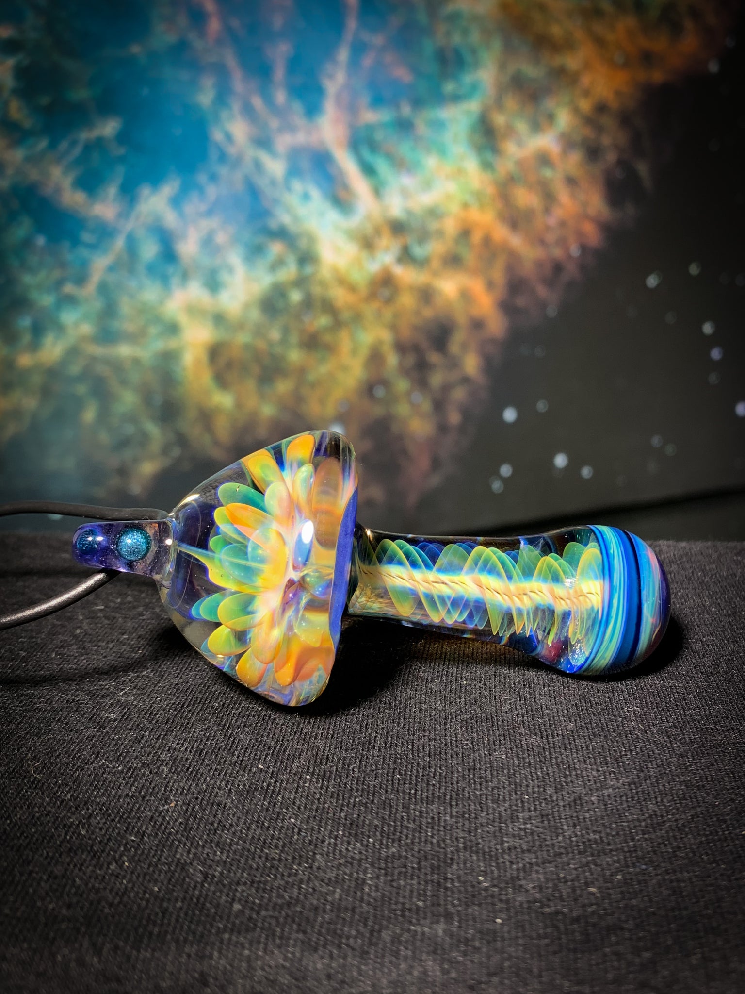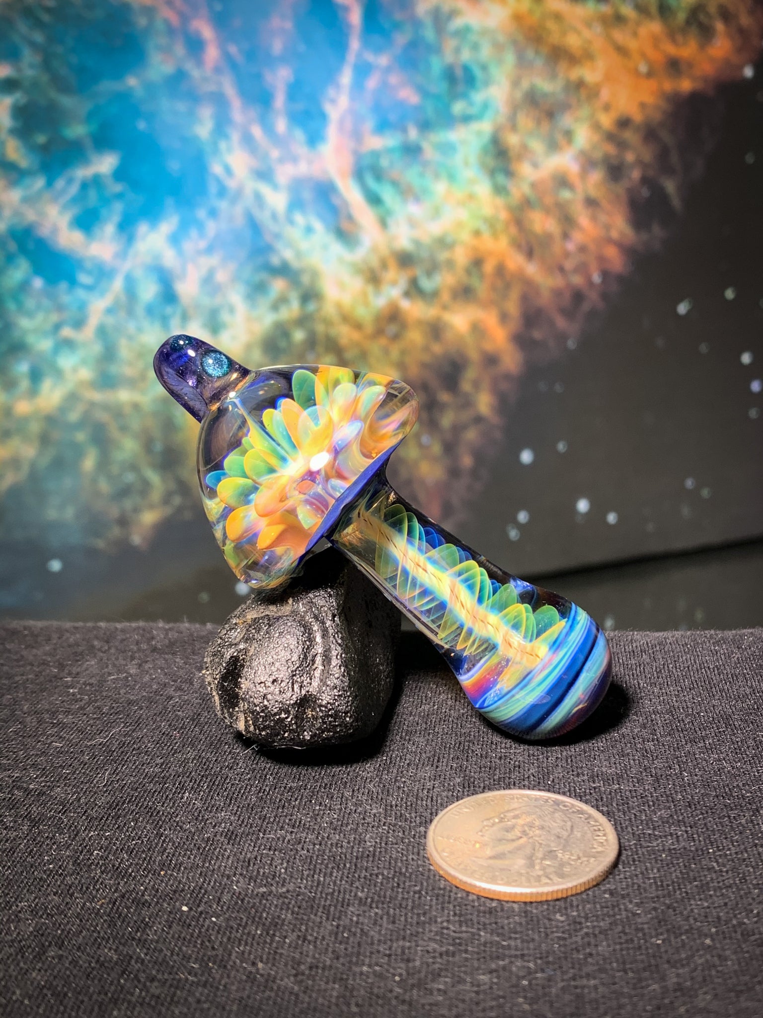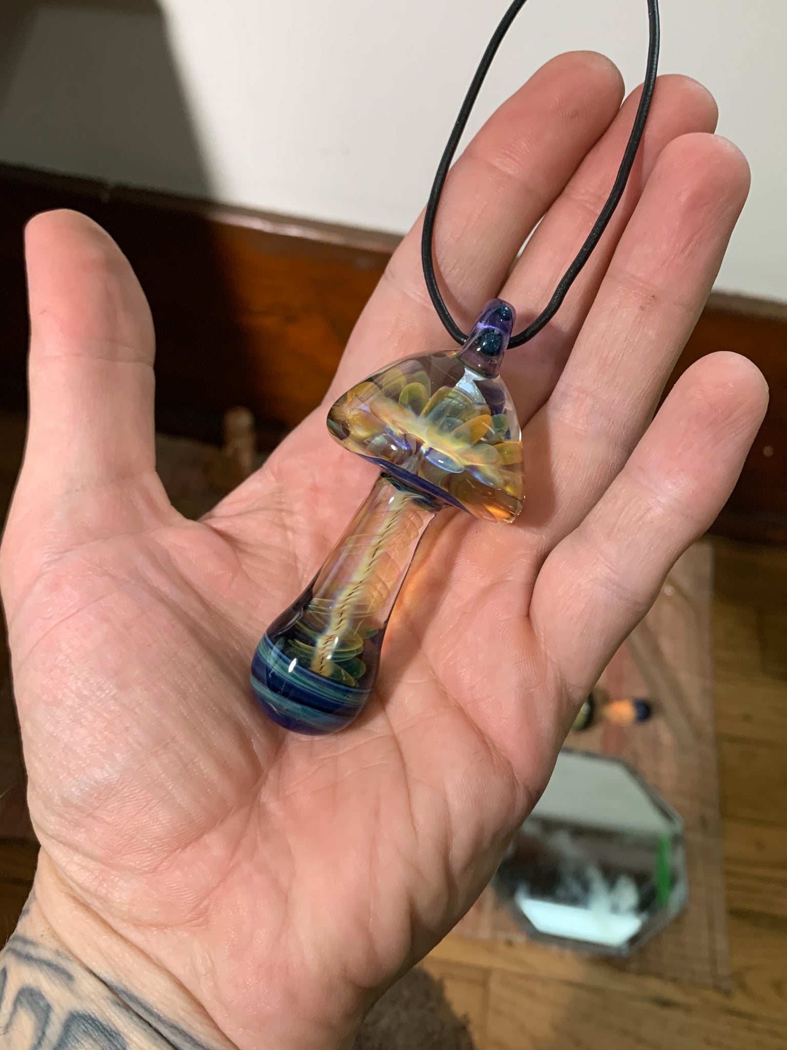 Pure gold and silver fume spectrum mushroom pendant with rainbow lotus inside the cap.