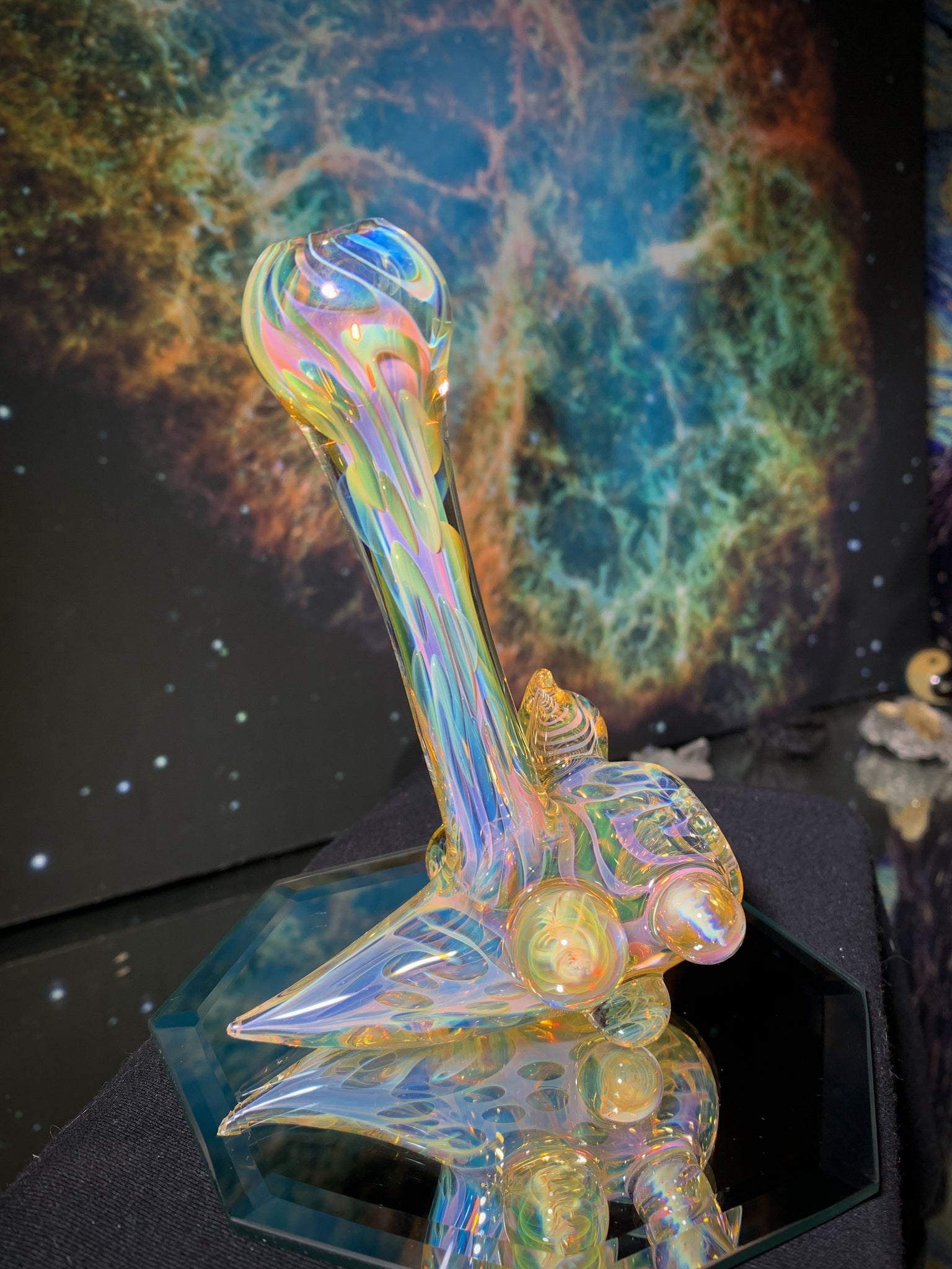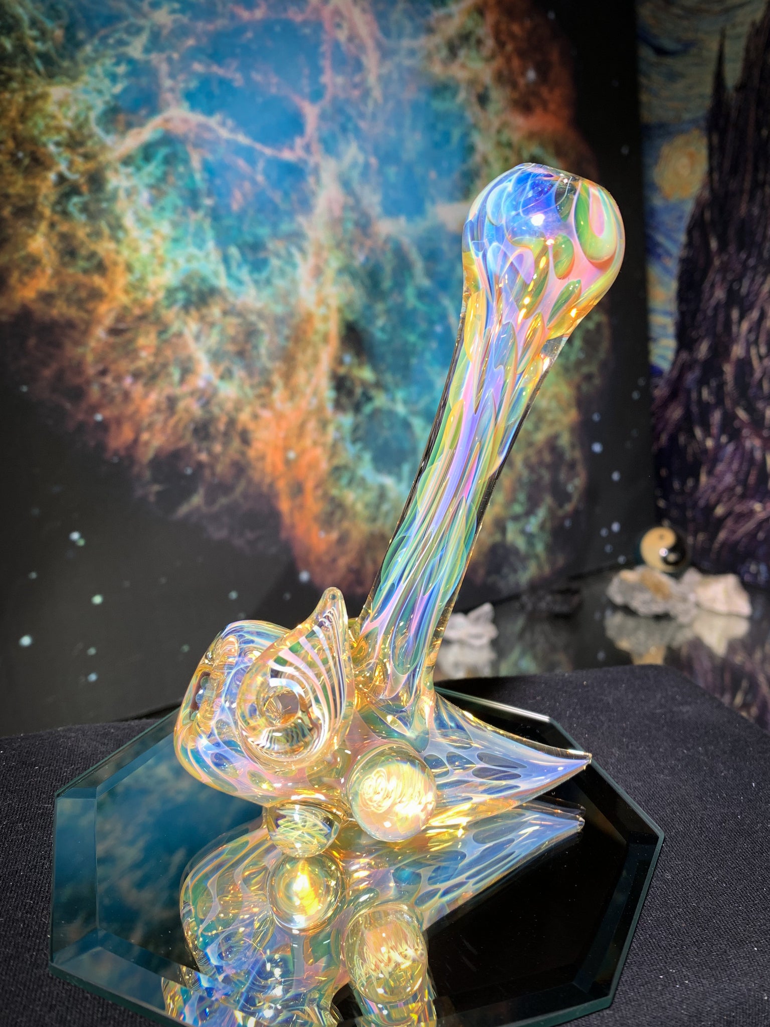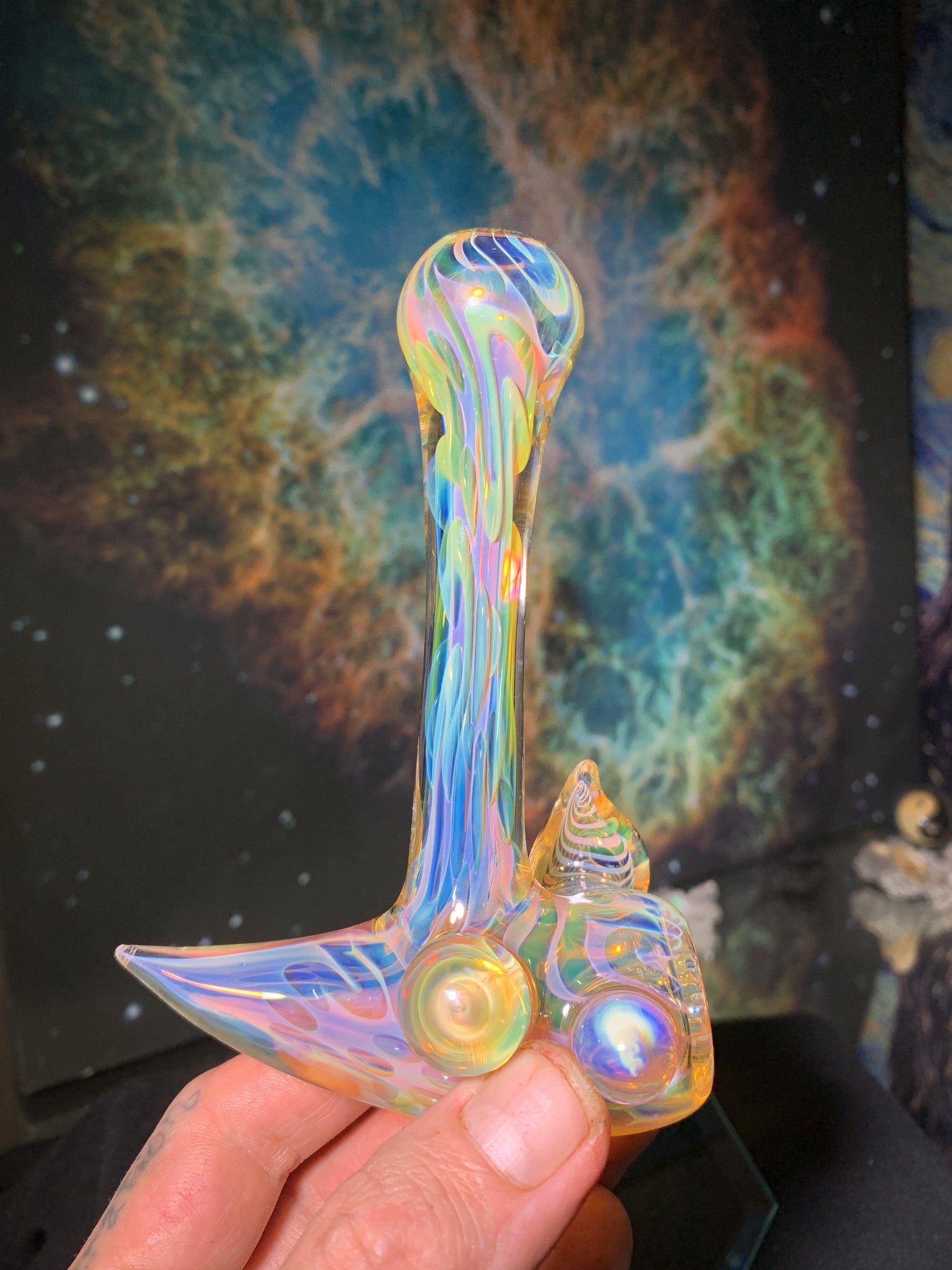 Beautiful gold and silver fume spectrums in a self standing hammer. Will change colors as it fills in and shifts colors in different light sources. Signed and dated entheo 2020.