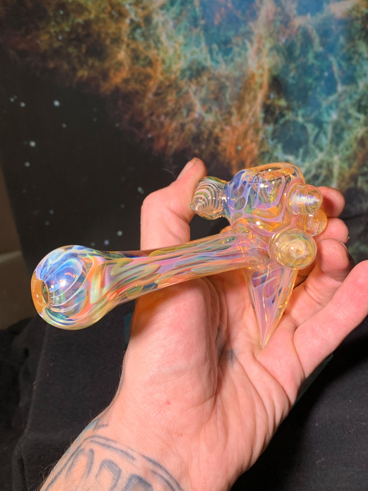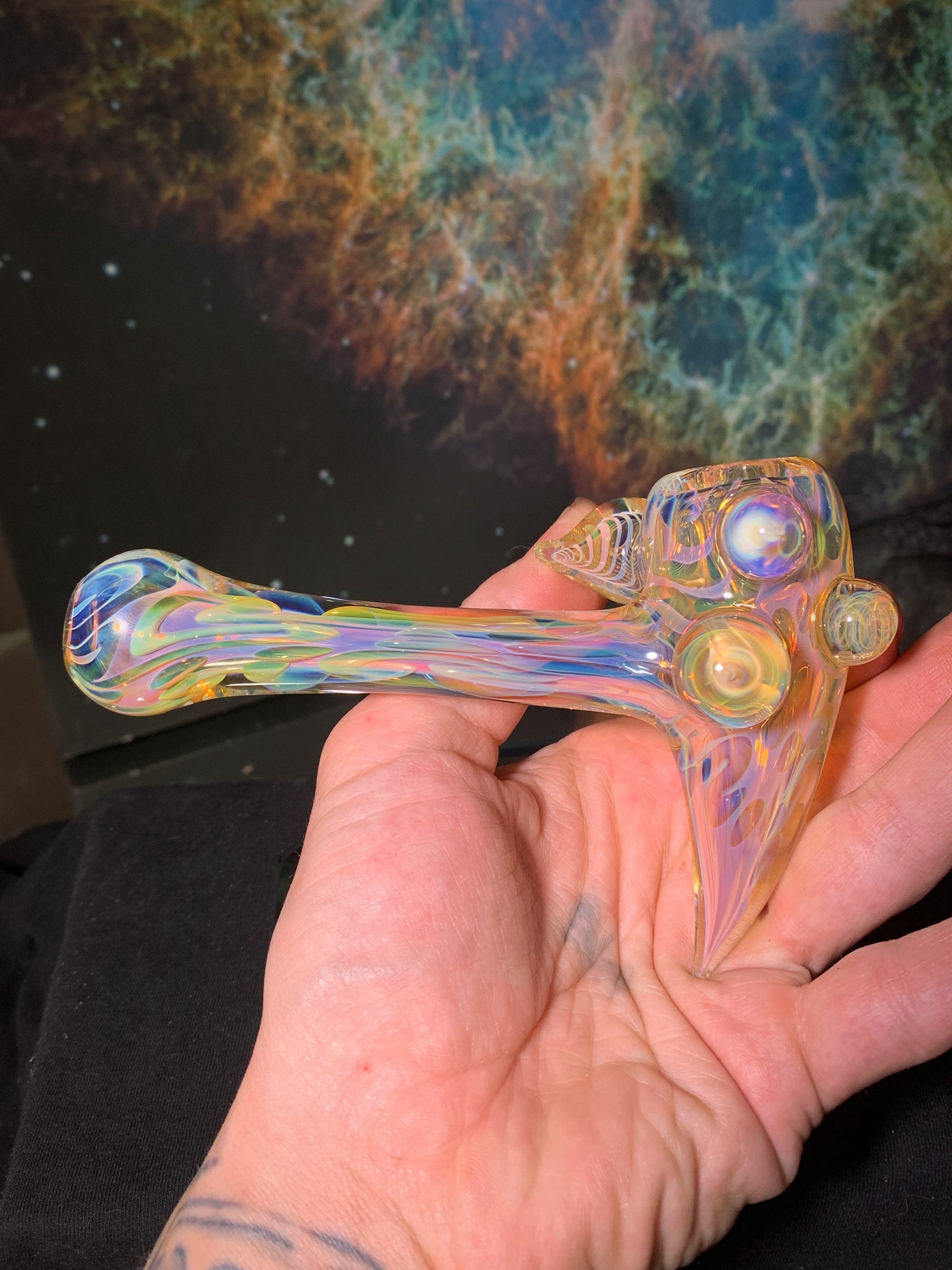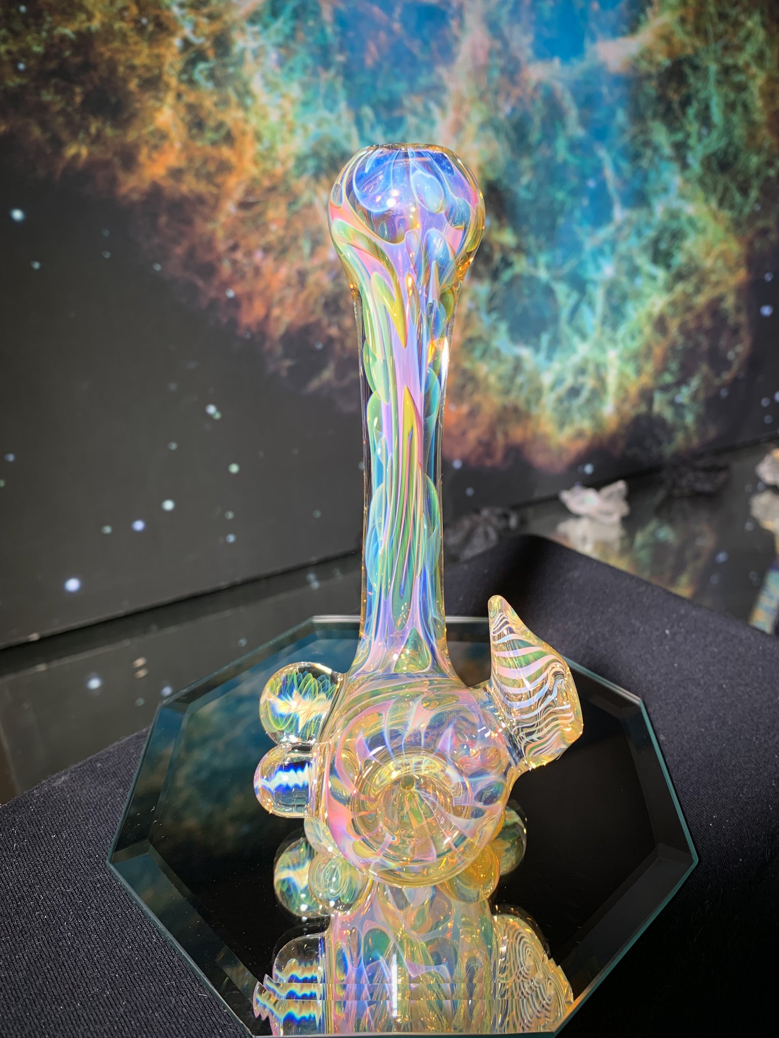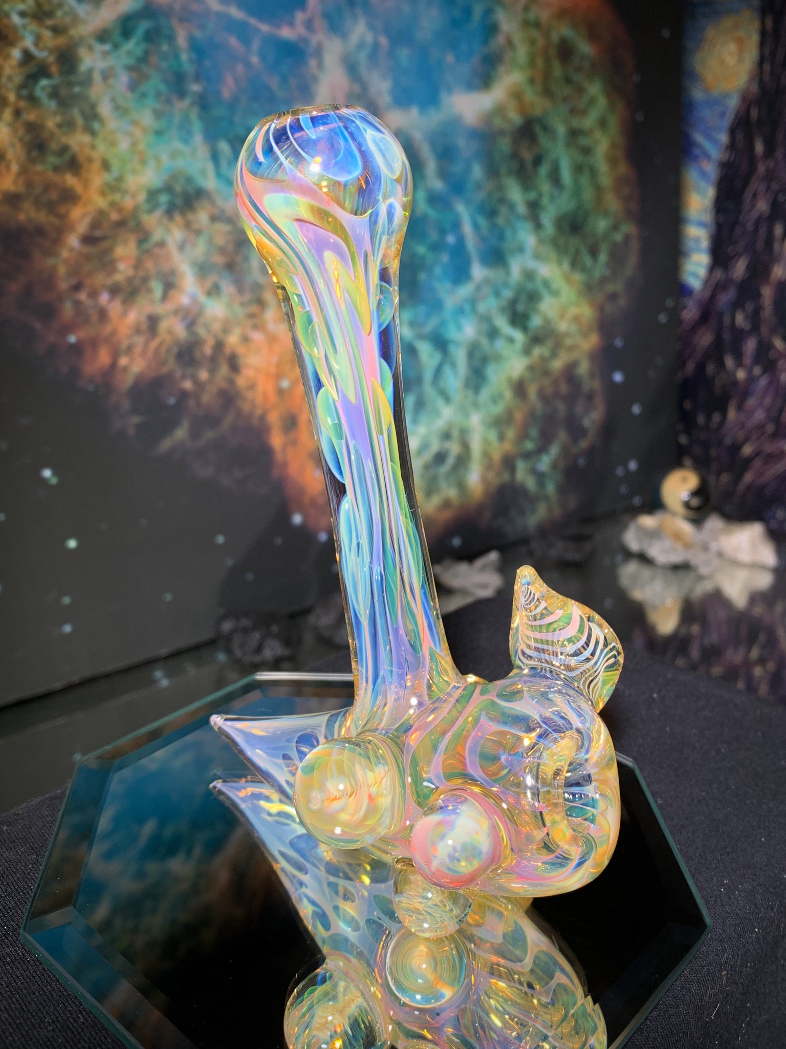 Beautiful gold and silver fume spectrums in a self standing hammer. Will change colors as it fills in and shifts colors in different light sources. Signed and dated entheo 2020.